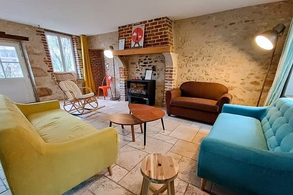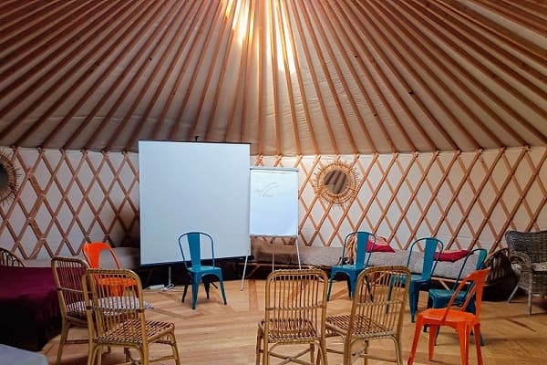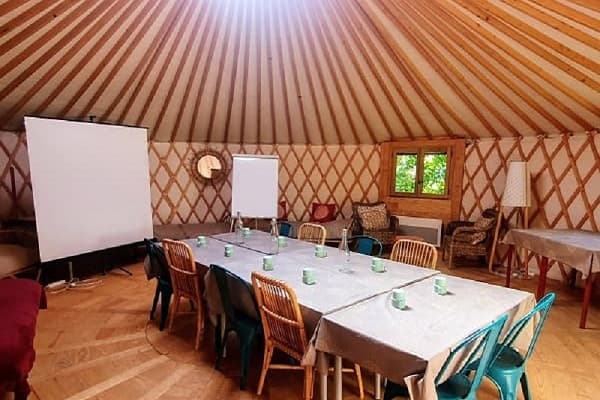 Salles : le séjour du Logis & sa cheminée, une yourte, lumière naturelle partout, mobilier chaleureux, écran, paperboard, Wi-Fi. Configurations adaptables (réunion, U, salon).
