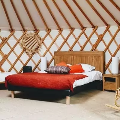 Les yourtes et Lodges, pour une immersion nomade. Chaque logement dispose de sa propre salle de bain, garantissant l’intimité nécessaire aux professionnels.